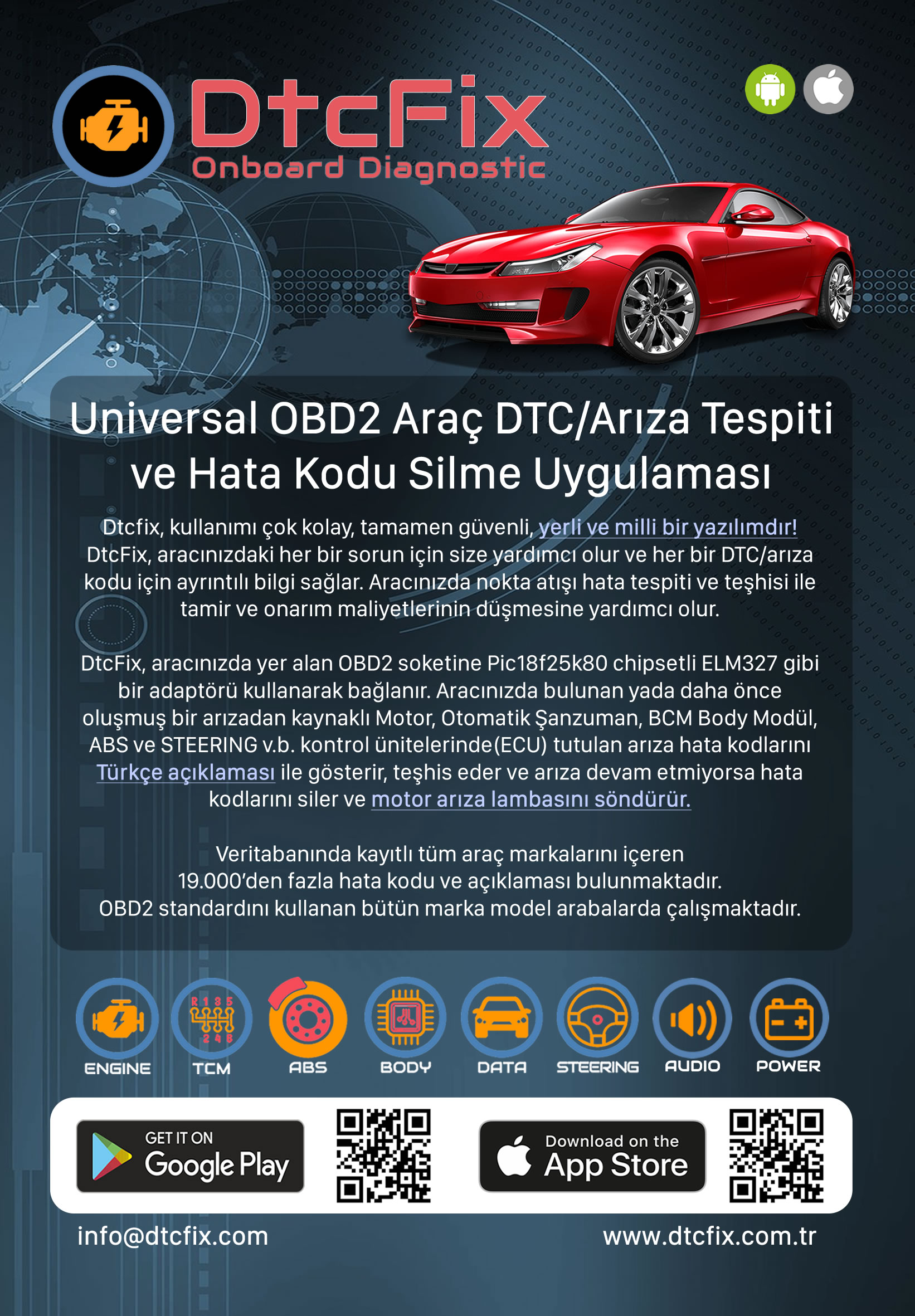 Doğru çözümü bul! - Uyumlu uygulamayı seç! Arabanızda devam eden yada daha önce oluşmuş bir hatadan kaynaklı araç motor kontrol ünitesinde(ECU) veya aracınızdaki tüm ECU'larda tutulan arıza kodlarını Türkçe açıklaması ile gösterir ve silebilir. Türkçe, Azerice, Almanca, Rusça, İspanyolca ve İngilizce dilini destekler. DtcFix arabanızın tamir ve onarım maliyetlerini düşürmeye yardımcı olur!